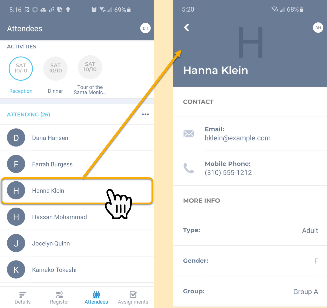 Email addresses, Phone numbers, and Addresses are further clickable to launch your phone's actions for those field types. You can click to call an Attendee by clicking on their mobile phone number, for example.